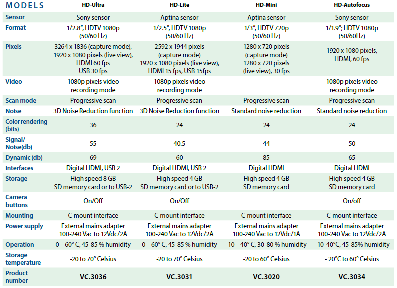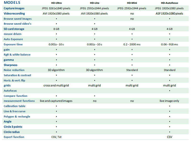 Với các camera HD-Ultra, HD-Lite và HD-Tự động lấy nét, hình ảnh được chụp hoặc video được ghi lại (1) có thể được xem lại hoặc phát lại rất dễ dàng trên màn hình HD. HD-Ultra thậm chí còn cung cấp đầy đủ các chức năng đo khi trực tiếp và ảnh được chụp lại. HD-Autofocus chỉ cung cấp các chức năng đo trên hình ảnh trực tiếp