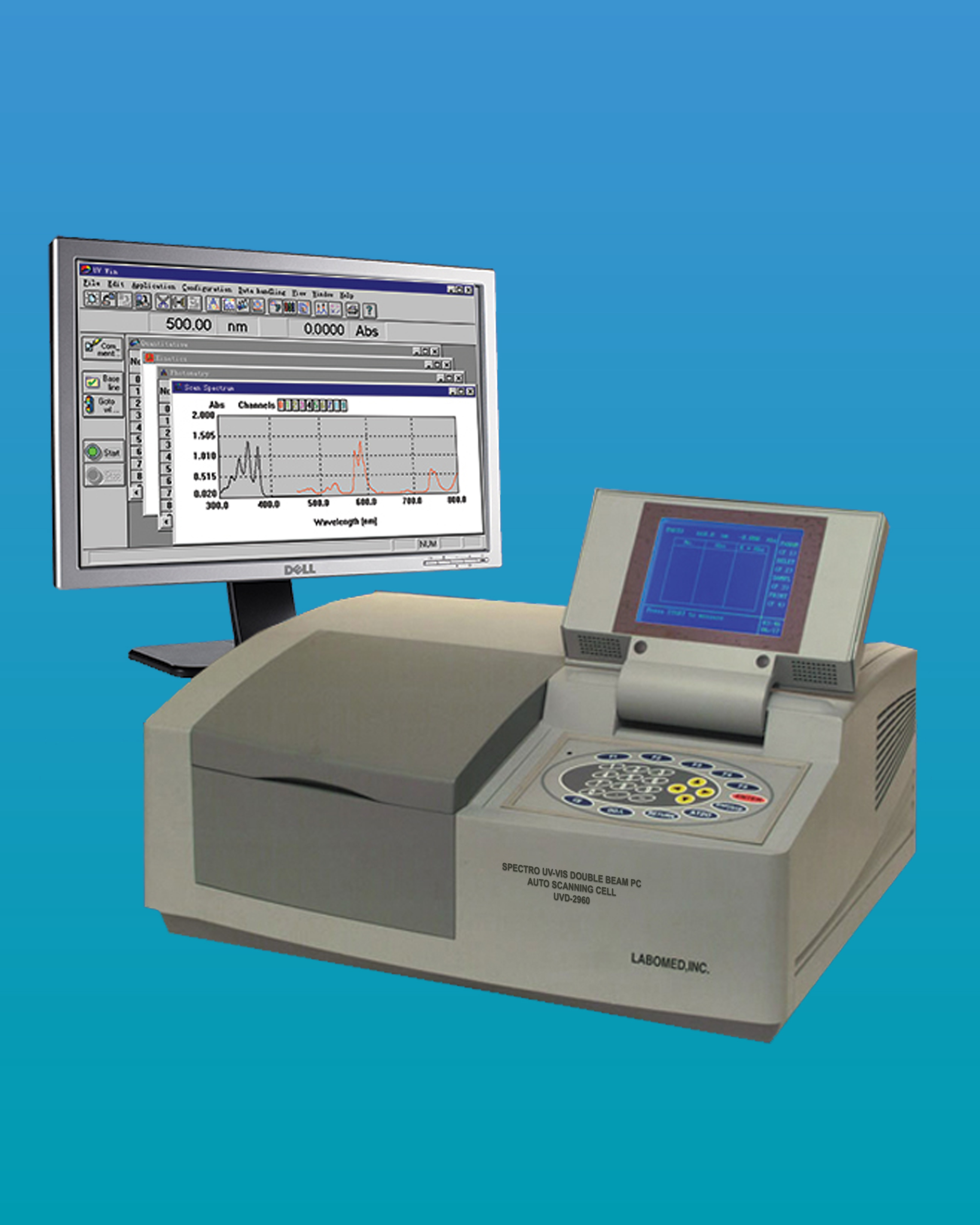 - Hiện nay, tất cả các máy đo quang phổ chùm tia kép của Labomed, Inc. đều với phần mềm mới được phát triển có tên là UV-Win 6.0 có thể được sử dụng với Windows XP, Windows 7 và Windows 8. Nó có khả năng thử nghiệm nhiều ứng dụng hơn với kết nối RS-232 và USB và hỗ trợ xuất dữ liệu các kết quả đo được thông qua PC và được lưu vào ổ đĩa flash, khi cần lưu trữ thêm dữ liệu. Một trong những tính năng mới là nó cung cấp đồ thị 3-D của các kết quả phổ.