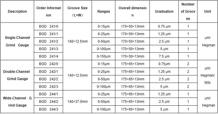 Thước và thanh gạt của nó được làm bằng thép không gỉ cứng và có một hoặc hai rãnh với độ dốc được phân cấp (phụ thuộc vào kiểu máy đã chọn), được chia độ bằng micrômet, mils, NS (Hegman). Được kiểm soát chính xác từng thước đo và đảm bảo nó có dung sai ± 2µm (của cả mặt bằng trên và mặt dưới, độ phẳng của mặt bằng nhỏ hơn 3µm).