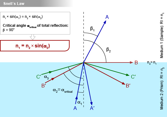 Định luật Snell có thể được áp dụng để xác định RI của môi trường 1. Định luật phát biểu rằng tỉ số của RI bằng tỉ số nghịch đảo của sin của các góc α1 và β1.