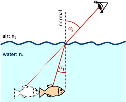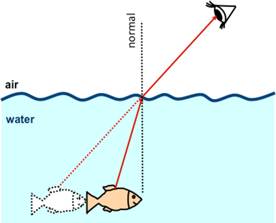 Một cách dễ dàng để hình dung hiện tượng này là dựa vào vị trí thực tế và quan sát một con cá bên dưới mặt nước. Sự khúc xạ ánh sáng rời khỏi nước và đi vào không khí khiến chúng ta cảm nhận được vị trí của cá gần hơn thực tế.