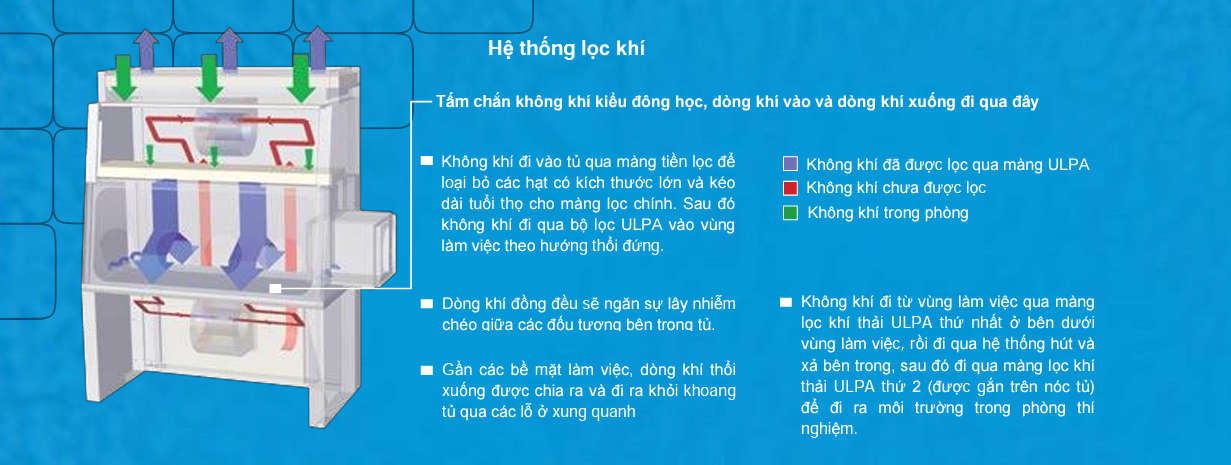 Dòng khí xuống được lọc qua màng lọc ULPA để bảo vệ mẫu; không khí chưa được lọc sẽ không được đưa vào vùng làm việc để ngăn chặn nhiễm bẩn mẫu.