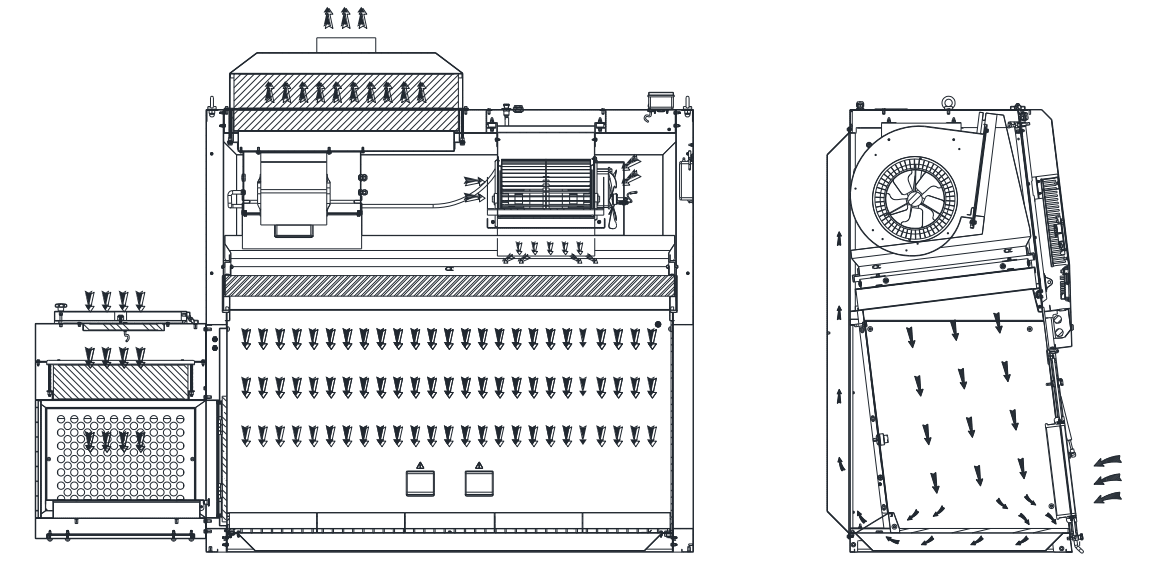 Hệ thống thông gió được cung cấp bởi hai quạt thổi khí, loại ly tâm điều khiển trực tiếp với hệ số hút kép và hệ số bảo vệ IP55. Bảo dưỡng quạt thổi dễ dàng từ phía trước của tủ.